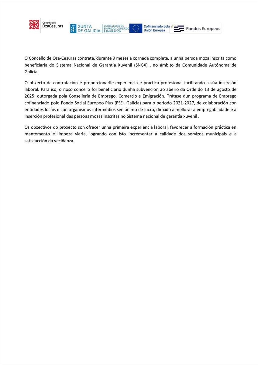 O concello de Oza-Cesuras recibiu unha subvención da Consellería de Medio Ambiente e Cambio Climático para a financiación de actuacións en materia de biorresiduos de competencia municipal, cofinanciadas polo fondo europeo relativo ao Mecanismo de recuperación e resilencia da UE no marco do Plan de recuperación, transformación e resilencia, financiado pola Unión Europea-Next GenerationEU, e se procede á súa convocatoria en réxime de concurrencia non competitiva por anticipado de gasto para o ano 2025