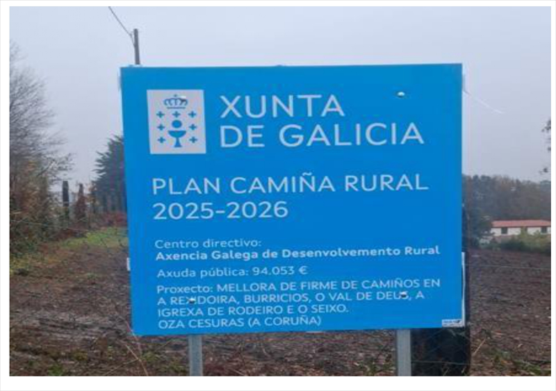 Oza-Cesuras recibiu unha subvención para a realización da actuación: "Mellora de firme de camiños en A Rexedoira, Burricios, O Val de Deus, A Igrexa de Rodeiro e O Seixo. Oza-Cesuras (A Coruña)"
