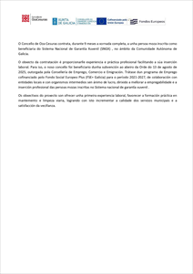 O concello de Oza-Cesuras recibiu unha subvención da Consellería de Medio Ambiente e Cambio Climático para a financiación de actuacións en materia de biorresiduos de competencia municipal, cofinanciadas polo fondo europeo relativo ao Mecanismo de recuperación e resilencia da UE no marco do Plan de recuperación, transformación e resilencia, financiado pola Unión Europea-Next GenerationEU, e se procede á súa convocatoria en réxime de concurrencia non competitiva por anticipado de gasto para o ano 2025